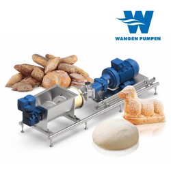 Hochviskoses, pastöses Fördergut (mit Viskositäten von bis zu 100.000 mPas) müssen in der Anlage schonend transportiert werden. Oftmals kommt es dabei zu Problemen und Störanfälligkeiten, denn Brot-, Kuchen-, Restteige, Hefelösungen, Füllmassen sowie dickflüssige Frucht-, Gemüse- und Zuckermassen können weder angesaugt werden, noch kann das Medium freifließend die Füllung des Pumpeneinlasses garantieren. Beim Eindosieren in den Herstellungsprozess können sich Unternehmen weltweit seit vielen Jahren auf die Leistung der WANGEN Hygiene-Pumpen verlassen. Die WANGEN VarioTwin NG eignet sich hervorragend zur schonenden Förderung dieser hochviskosen, zähfließenden Medien und ist die patentierte Ergänzung zur WANGEN Twin NG Schraubenspindelpumpe. Ein Zusatzmodul mit Rachen und Zuführschnecke, in variabler Länge erhältlich, einfach und effektiv zu reinigen und optimal abgestimmt auf den jeweiligen Einsatzbereich und Ihre Bedürfnisse.