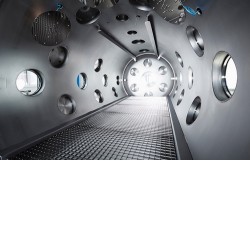 Für Raumfahrtmissionen und Projekte liefert Leybold als ganzheitlicher Anbieter die dafür notwendige Technik – bis hin zum Ultrahochvakuum. Auf der Space Tech Expo Europe, die vom 19. bis 21. November in Bremen stattfand, präsentierte der Vakuumspezialist seine Produktlösungen für die Entwicklung, Herstellung und Erprobung von Raumfahrzeugen, Satelliten und weltraumbezogenen Techniken. Man bietet dafür eine ganze Palette standardisierter und spezifischer Systemlösungen mit integrierten Vorvakuum- und Hochvakuumpumpen an – individuell zugeschnitten auf die jeweiligen Anforderungen. Ein wachsender Anwendungsfall ist zum Beispiel das Simulieren und Testen von elektrischen Weltraumantrieben zur Bewegung von Raumfahrzeugen. Dafür werden ionisierte Gaspartikel durch ein elektrisches Feld beschleunigt. Moderne Ionen-Triebwerke erzeugen einen Gasstrom von 0,1 bis 10 mg/s. Um ein gutes Hochvakuum bei diesem erheblichen Durchfluss in den Prüfkammern aufrechtzuerhalten, ist ein sehr großes Saugvermögen erforderlich – oft im Bereich von 10.000 bis 100.000 l/s. Die dafür notwendigen experimentellen Kammersysteme zur Herstellung der Weltraumbedingungen existieren in allen Größen: von wenigen Litern zum Testen kleiner Objekte wie Leiterplatten bis hin zu mehreren tausend Kubikmetern für den Nachweis der Raumfahrttauglichkeit ganzer Raumschiffe. Das Edelgas Xenon ist das schwerste stabile Edelgas und wird aufgrund des hohen resultierenden Schubs in den meisten Fällen für Ionentriebwerke verwendet. Der Vorteil einer großen Antriebsmasse ist aber eine große Herausforderung für Vakuumpumpen. Einer der Gründe ist die schlechte Wärmeleitfähigkeit von Xenongas, die zu kritischen Temperaturanstiegen bei Gastransfer-Vakuumpumpen wie Turbomolekularpumpen führt. Außerdem wären viele große Turbomolekularpumpen erforderlich, um das geforderte hohe Saugvermögen zu erreichen. Der Hersteller hat eine optimierte und einfache kryogene Lösung für das Pumpen von Xenon entwickelt. Die starken einstufigen Kaltköpfe vom Typ Gifford-McMahon tragen Metallplatten, die das Xenongas mit einem Saugvermögen am Rande des theoretischen Limits kondensieren.