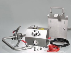 Mit dem Entnahmesystem für Lösemittel von Bürkle lassen sich hochreine Flüssigkeiten schnell und unkompliziert abfüllen. Mittels Druckgas (Druckluft oder Stickstoff) wird ein Überdruck im Gebinde hergestellt, der die Flüssigkeit aus dem Behälter fördert. Die Bedienung über Druckgas bietet den Vorteil, dass der Anwender ohne Mühe auch große Mengen entnehmen kann und dabei beide Hände frei hat, um das Lösemittel abzufüllen. Das Entnahmesystem hat eine Fasspumpe mit festem Auslaufbogen. Das stufenlos einstellbare Tauchrohr der Fasspumpe lässt sich an den jeweiligen Behälter anpassen.