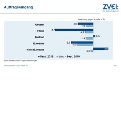 Die Auftragseingänge lagen im September 2019 in der deutschen Elektroindustrie nach Angaben des ZVEI um 3,9 % unter ihrem Vorjahreswert.