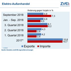 Die Exporte der deutschen Elektroindustrie sind nach Mitteilung des ZVEI im September 2018 um 4,9 % gegenüber Vorjahr auf 17,9 Mrd. Euro gestiegen.