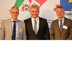 Die Niederlande, Flandern und Nordrhein-Westfalen haben sich gemeinsam zum Ziel gesetzt, die wirtschaftlichen Rahmenbedingungen für die Chemieindustrie zu verbessern und grenzüberschreitend neue Impulse im globalen Wettbewerb zu setzen. Der Ansatz der grenzüberschreitenden Zusammenarbeit zur Stärkung der Chemieindustrie ist in dieser Form einzigartig. Wirtschafts- und Digitalminister Prof. Dr. Andreas Pinkwart (Mitte) begrüßte die rund 100 Gäste zur Vorstellung der trilateralen Chemiestrategie in der Landesvertretung Nordrhein-Westfalens bei der EU in Brüssel. Gemeinsam mit Maarten Camps (rechts), Generalsekretär im Wirtschaftsministerium der Niederlande, und Johan Hanssens (links), Generalsekretär im flämischen Ministerium für Wirtschaft, Wissenschaft und Innovation, stellte er die zentralen Eckpunkte der Strategie vor. Minister Pinkwart: "Gemeinsam bilden die Niederlande, Flandern und Nordrhein-Westfalen einen der stärksten Chemie-Industrie-Cluster der Welt. Die Chemie ist ein Pfeiler unseres Wohlstands und ein zentraler Pfeiler der europäischen Industrie. Jedoch steht die Branche vor großen Herausforderungen. Umso wichtiger ist die Zusammenarbeit unserer Regionen, um die regionale Innovationsfähigkeit zu stärken."