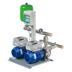Ein oder zwei horizontale Kreiselpumpen mit Frequenzumrichter sind auf einer Grundplatte montiert. Die Drehzahlregelung aller Pumpen sorgt für eine energieeffiziente Fahrweise und hält den Druck auch bei schwankender Wasserentnahme konstant. Ein elektronischer Trockenlaufschutz für die Pumpen ist integriert. Durch die Verwendung von pulverbeschichteten Werkstoffen und Edelstahl bei den Medium berührten Teilen ist die Anlage sehr korrosionsbeständig.