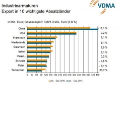 2016 erzielten die deutschen Industriearmaturenhersteller ein Exportvolumen von 3,6 Mrd. Euro, dies ist ein Plus von 2,8 % im Vergleich zum Vorjahr. Erfreulich waren die Ausfuhren ins europäische Ausland. Wachstum kommt in erster linie aus Europa. Besonders Tschechien (plus 23,7 %), Österreich (plus 9,5 %) und die Niederlande (plus 9,1 %) legten zu. Die Nachfrage in Großbritannien nach Industriearmaturen aus Deutschland war bis zur Jahreshälfte 2016 noch stark rückläufig. Dieser Trend hat sich zum Jahresende hin nicht fortgesetzt (plus 0,2 %). Auch wenn die Unsicherheit hinsichtlich der wirtschaftlichen Entwicklung des Landes groß ist, zeigen sich die Ökonomen auf der Insel optimistisch und hoben die Konjunkturprognosen für 2017 an. Auf der Liste der Top-10 Absatzländer landete Frankreich auf Rang 3 mit 191,5 Mio. Euro (plus5,1 %). Hier schlug das verbesserte Investitionsklima und die wachsende Chemiewirtschaft zu Buche.