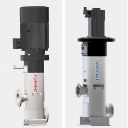 Die Hyghspin- und Chemspin-Pumpen ermöglichen eine freie vertikale Aufstellung im Raum ohne seitliche Strukturen für horizontal laufende Rohrleitungen. Die Blockbauweise ist ein Konstruktionsmerkmal des norddeutschen Pumpenherstellers, der seit 2009 hygienische Edelstahlpumpen nach diesem Prinzip baut. Pumpe und Motorwelle sind durch Formschluss zueinander zentriert und können sich nicht verschieben. Dies vermeidet Probleme durch nicht ausgerichtete oder verspannte Kupplungen. Die Schraubenspindelpumpen können so auch vertikal auf dem Frontdeckel freistehend wie mehrstufige Kreiselpumpen montiert werden.